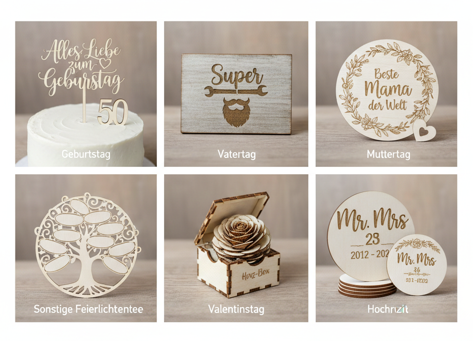 Verleihen Sie Ihren Geschenken und Accessoires eine ganz persönliche Note. Ob Namen, Widmungen oder Logos – wir verwandeln hochwertiges Holz in unverwechselbare Erinnerungsstücke, die ein Leben lang bleiben.
