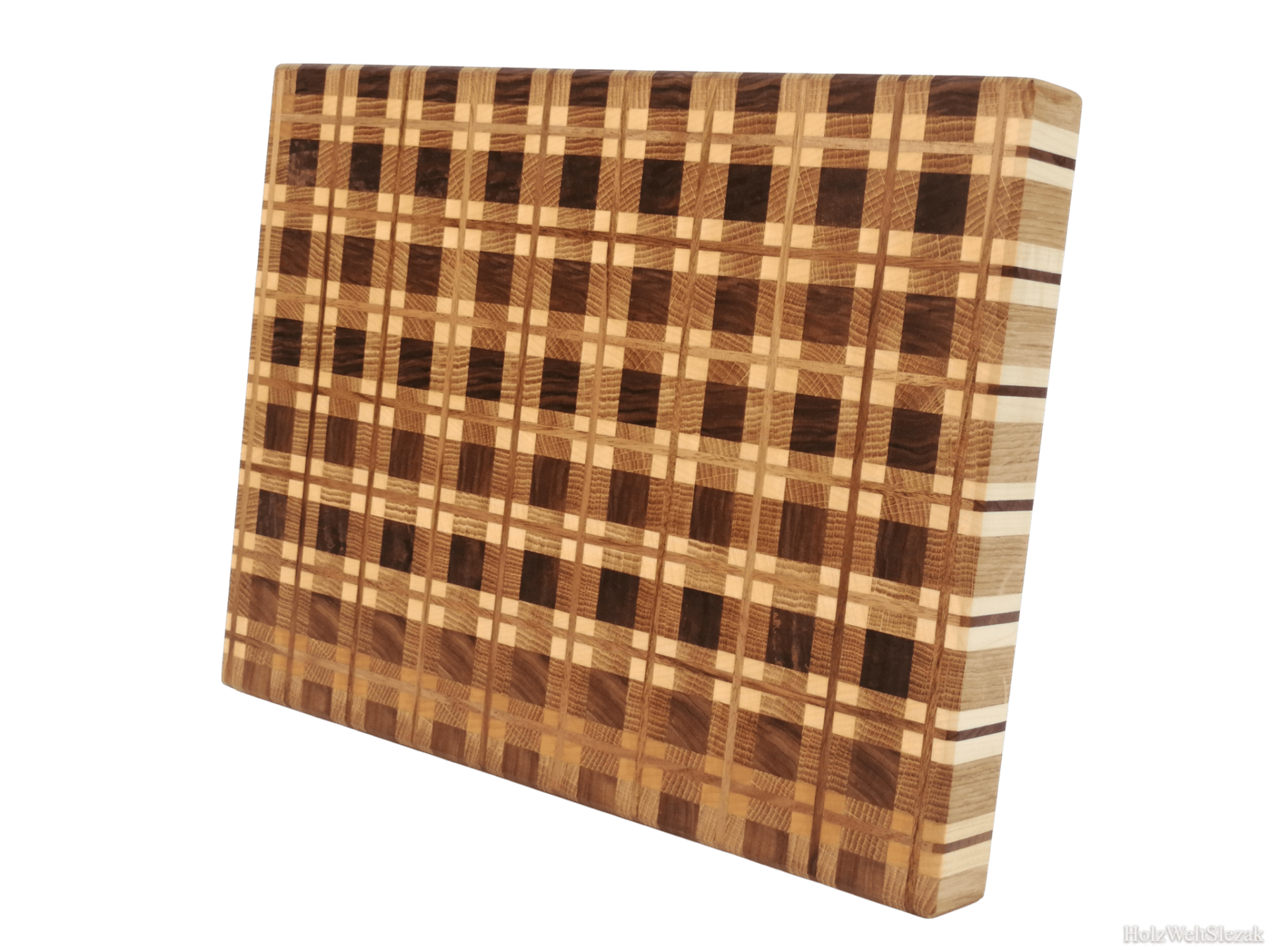 Das Hirnholz-Schneidebrett »Karomuster« ist ein filigranes Meisterstück, das höchste Präzision mit überragender Funktionalität verbindet. Das dichte Muster wird durch die Kombination aus hellem Ahorn, warmer Eiche und tiefdunklem Nussbaumholz geschaffen. Das Ergebnis ist ein detailliertes und kontrastreiches Schachbrettmuster, das durch seine feine Ausführung besticht.