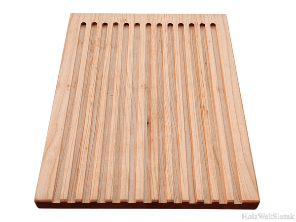 Die Oberseite ist mit einer großflächigen, tief in das Massivholz gefrästen Rillenstruktur ausgestattet. Diese speziellen Krümelrillen fangen alle Brotkrümel zuverlässig auf und halten so Ihre Arbeitsfläche effektiv sauber.
