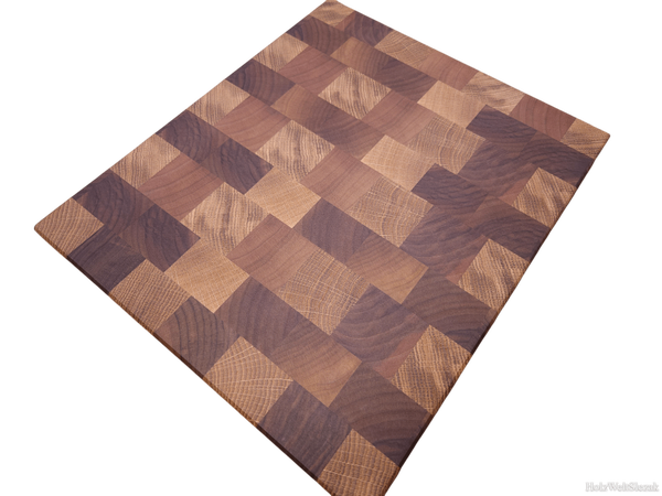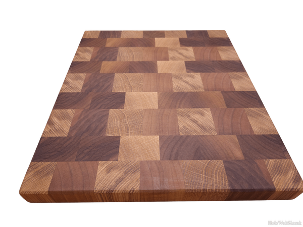 Das Hirnholz-Schneidebrett »Eiche-Nuss Kontrast« vereint die Härte und rustikale Schönheit der Eiche mit der eleganten, dunklen Maserung des Nussbaums. Dieses massive Stirnholz-Brett von HolzWeltSlezak besticht durch sein tiefes, kontrastreiches Farbschema, das in jeder Küche ein optisches Highlight setzt.