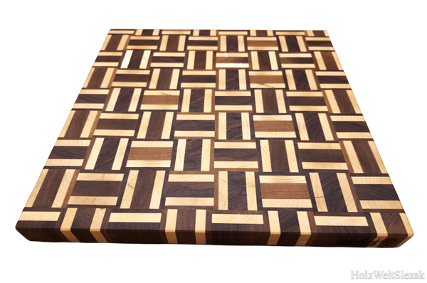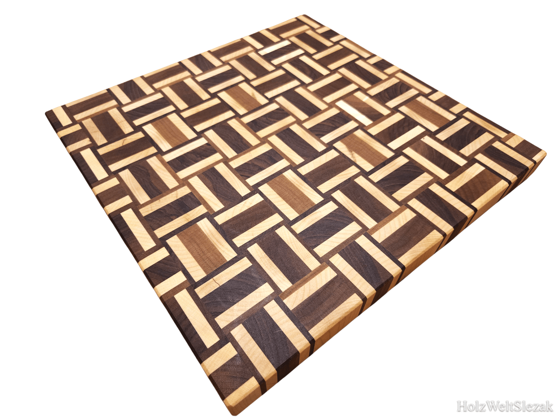 Das Hirnholz-Schneidebrett »Der Kontrast-Meister II« ist ein Statement für jede Premium-Küche. Gefertigt aus der faszinierenden Kombination von dunklem Amerikanischem Nussbaum (Walnuss) und hellem Ahornholz (Maple), bietet dieses massive Stirnholz-Brett eine einzigartige Ästhetik und kompromisslose Performance.